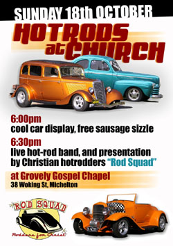 Rod Squad is excited about heading to Grovely on the Northside of Brisbane, to run a special outdoors evening church service, complete with car display, free sausage-sizzle, and the live Rod Squad band.